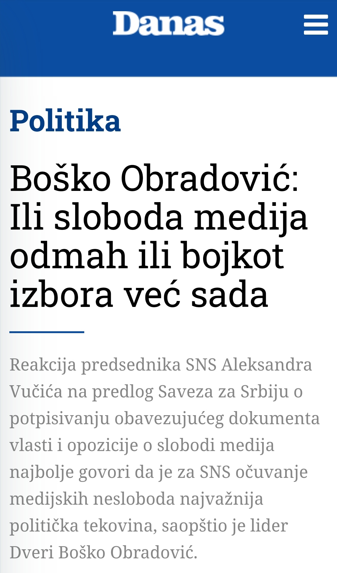 Мислим да наведени примери, а посебно победа опозиције 30. августа 2020. године у Црној Гори, јасно показују да неслободна телевизија ни у ком случају не може бити разлог за лоше резултате на изборима, али може бити изговор. Конкретно, кад је реч о појединцима истранкама окупљеним у СзС разлог лежи у томе што се ни у ком погледу не разликују од Александра Вучића, СНС-а и њихових сателита.