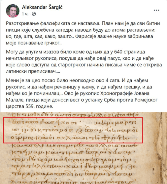 Мени је за цео посао било неопходно око 4 сата. И да нађем рукопис, и да нађем реченицу у њему, и да нађем грешку, и да нађем ко је починилац… Ово је рукопис Хронографије Јована Малале, писца који доноси вест о устанку Срба против Ромејског царства 559. године.”