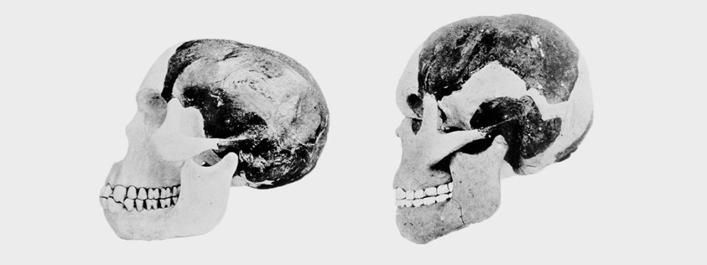 ”Немци су могли да укажу на своје костуре Неандерталаца и тврде да је прво примитивно људско биће било Немац. Французи су могли да се супротставе да је њихов Кромањонац – древан, иако не толико стар као немачки неандерталци – био предак који је изгледао модерније и напредније; те да је стога први прави човек био Француз. Фосили су такође пронађени у Белгији и Шпанији, тако да Белгијанци и Шпанци могу да траже за себе место у саги људског порекла и развоја. Чак и тако мала нација, као што је Холандија, могла би да полаже право на место у историји људске еволуције; 1891. године Холанђанин, Еуген Дибоа (Eugene Dubois), открио је фосилизиране остатке примитивног људског претка на Јави, острву у холандској колонији Холандска Источна Индија (сада Индонезија). Међутим, једна велика европска нација није и није могла материјално да допринесе дебати око крајњег порекла човечанства. Та нација је била Енглеска.