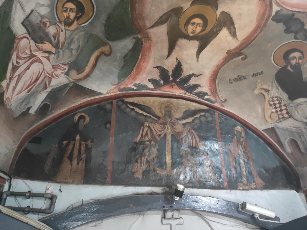 Композиција изнад улазних врата. Десно од Пресвете Богородице налази се лик Светог Краља Милутина