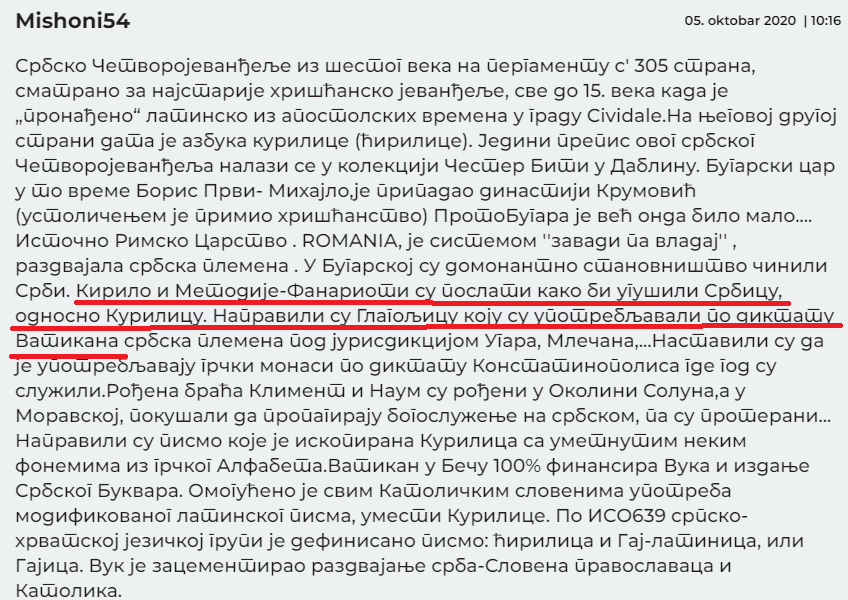И одбацивање чињенице да су прво словенско писмо створили Свети Ћирило и Методије ради се плански у сврху урушавања националног идентитета. Тврдња да смо имали своје писмо и пре Свете Равноапостолне Браће служи да се ћирилица представи као наметнута и одбаци као наше национално писмо и битан део националног идентитета. Уместо ћирилице као наше писмо нам се намеће измишљене винчаница, србица, куралица, буквица и сл. Образац је исти као и у случају хришћанства – намеће нам се лаж да смо силом покрштени како би се код нас јавио отпор и како бисмо лакше прихватили неопаганизам као нашу ‘’стару веру’’. (16)