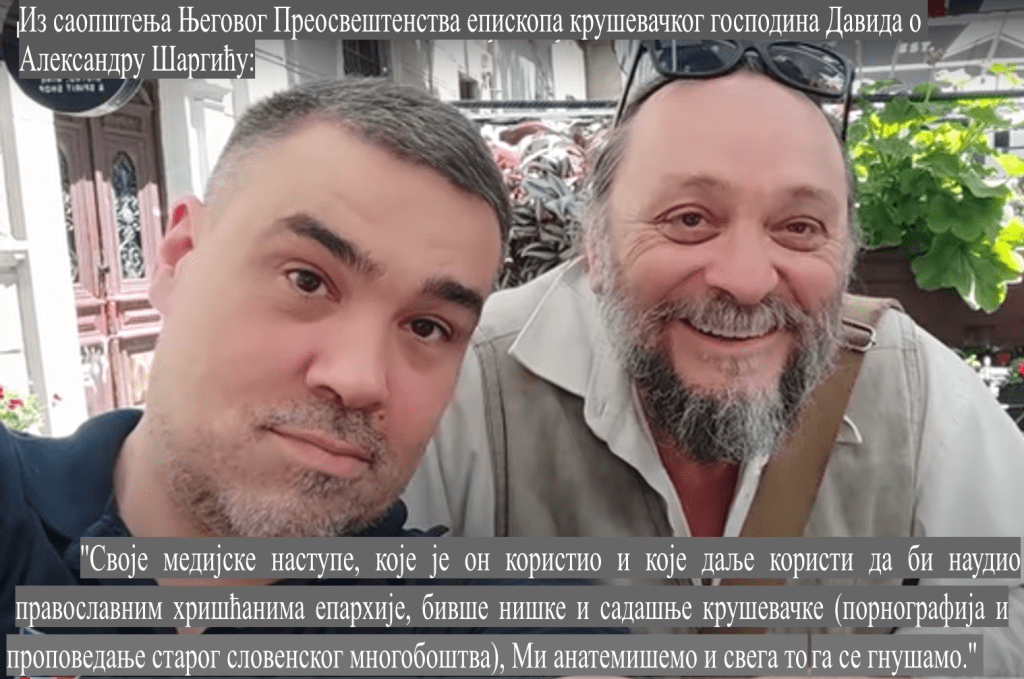 „Обавештавамо православне хришћане Епархије крушевачке да Ми, епископ крушевачки Давид и сав клир црквени немамо никакву везу са јеретичким проповедањем, учењем и деловањем Александра Шаргића из Крушевца. Своје медијске наступе, које је он користио и које даље користи да би наудио православним хришћанима епархије, бивше нишке и садашње крушевачке (порнографија и проповедање старог словенског многобоштва), Ми анатемишемо и свега тога се гнушамо.