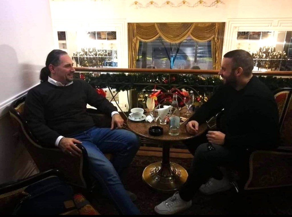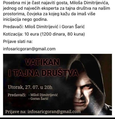 Међутим, не дружи се Горан Шарић само са усташким генералом Пркачином и неопаганином Александром Шаргићем већ и са сатанистом Милошем Димитријевићем. На фотографији испод их видимо како пију пиће у неком угоститељском објекту а да у питању није случајан сусрет показују и заједничка ”предавања” која су држали.