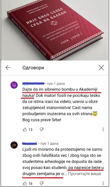 Бројни су и коментари у којима се претње изричу и у множини и односе се на све домаће историчаре: ”Кад тад ћемо вас очистити из Србије”, ” Згазићемо вас!!! И све до једног! ”, ”Живим за дан кад ћемо се обрачунати…”, ”Сва уср.нагов.а (цензура је моја, Д. М.) која ће ускоро да дркћу и моле биће почишћена и завршиће тамо где им је место”, и тако даље. На фотографији испод видимо позив да се у САНУ баци бомба. У питању су коментари испод објаве о књизи Александра Шаргића и Александра Митића ”Није било сеобе Срба на Балкан”.