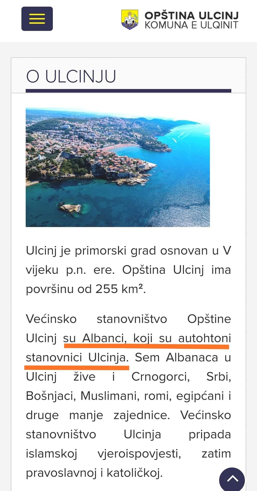 На званичној презентацији општине Улцињ можемо да прочитамо следеће: “Већинско становништво Општине Улцињ су Албанци, који су аутохтони становници Улциња.”
