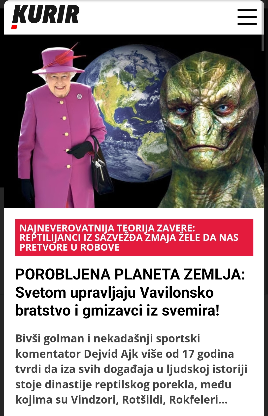 Један од текстова у гласилима о теоријама завере Дејвида Ајка