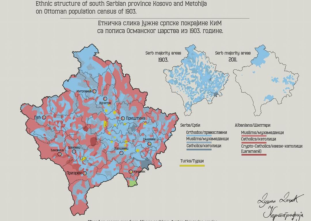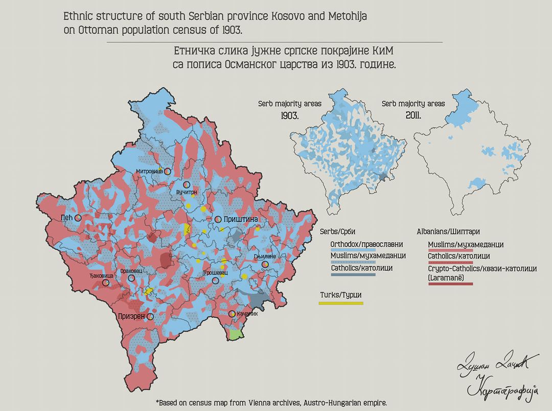 ”Са турским освајањем српских држава и Арбаније… стара српско-арбанашка етничка граница је прекинута на неким местима и преко тих места је почело продирање Арбанаса, или боље речено почела се осећати арбанашка тежа за продирањем на исток. У другој половини 16. века, 1574. писац једног записа се јада на арбанашке зулуме у околини Призрена, Ђаковице, Пећи и Скадра. Срби су у то време у тим крајевима још чинили гро масе, јер баш наредне, 1575. године млетачки посланик Јаков Соранцо, путујући преко Љеша у Скопље, прешавши негде Бели Дрим изнад његовог састава са Црним Дримом (ове две реке се спајају у данашњој североисточној Албанији код града Кукеша, примедба Д.М.), каже да ту остављају Арбанију и улазе у Србију, као и то да ту остављају становнишгво арбанашког језика и улазе у крајеве сгановнишгва словенског језика. To исто веле и неки сами Арбанаси из тога доба. Tако барски надбискуп Марин Бици 1610. године такође узима Црни Дрим за границу Арбаније и Србије и прешавши њу, на путу за исток, вели да одатле влада ,,далматински“ (la lingua dalmata). Петар Масареки, апостолски визитатор, такође Арбанас, 1623. године, каже да у Призренском пољу има заселака арбанашких, да највише Арбанаса има у призренском крају преко Дрима, западно од Дрима, који, како и он каже, дели Арбанију од Србије.