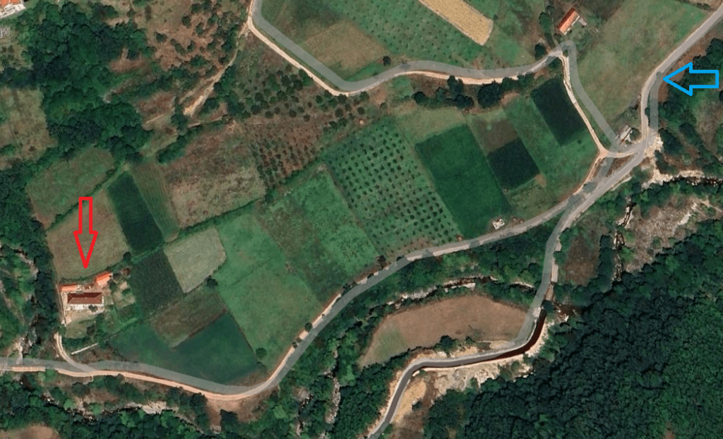 Црвеном стрелицом је на сателитском снимку означено гробље а плавом стрелицом смер из кога се долази ка гробљу, било да се долази из Буреља (Burell) или Клоса (Klos).