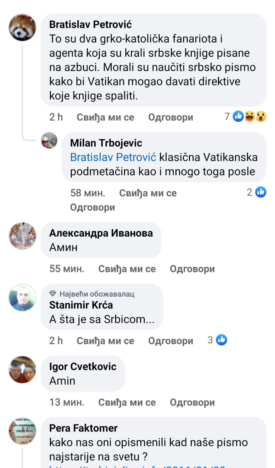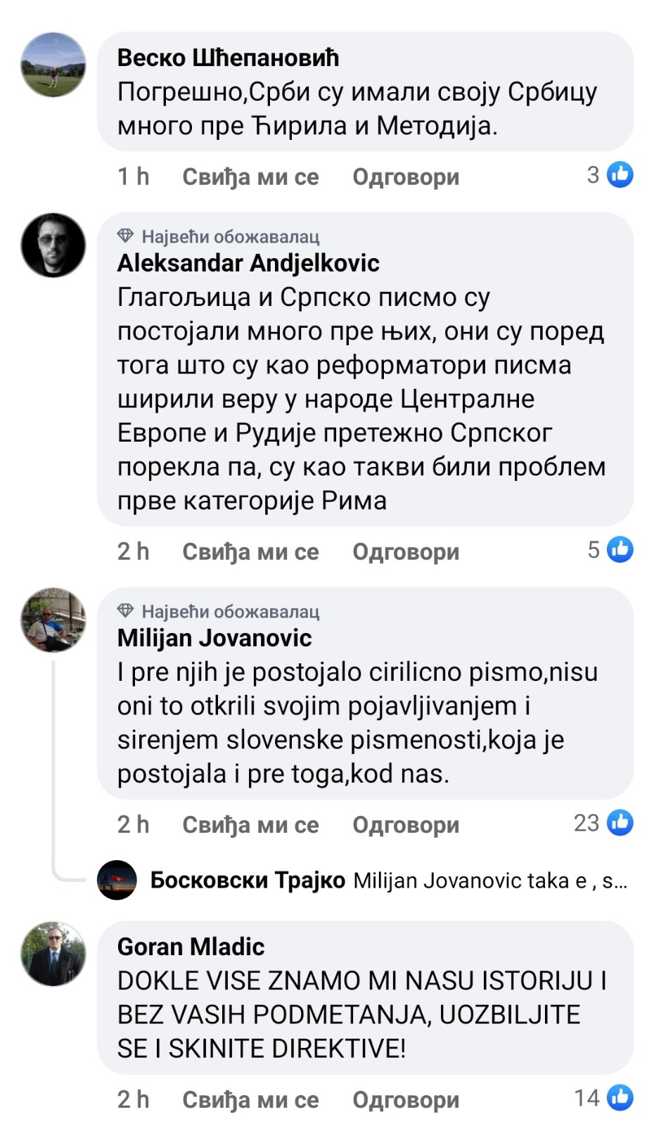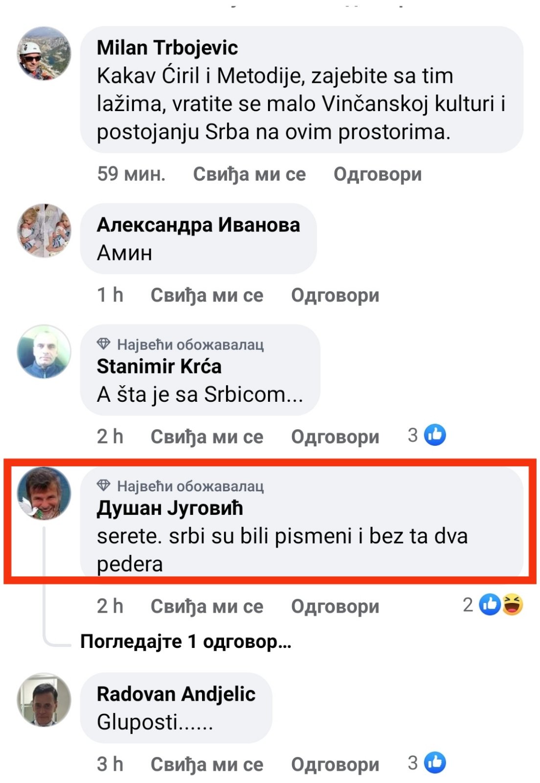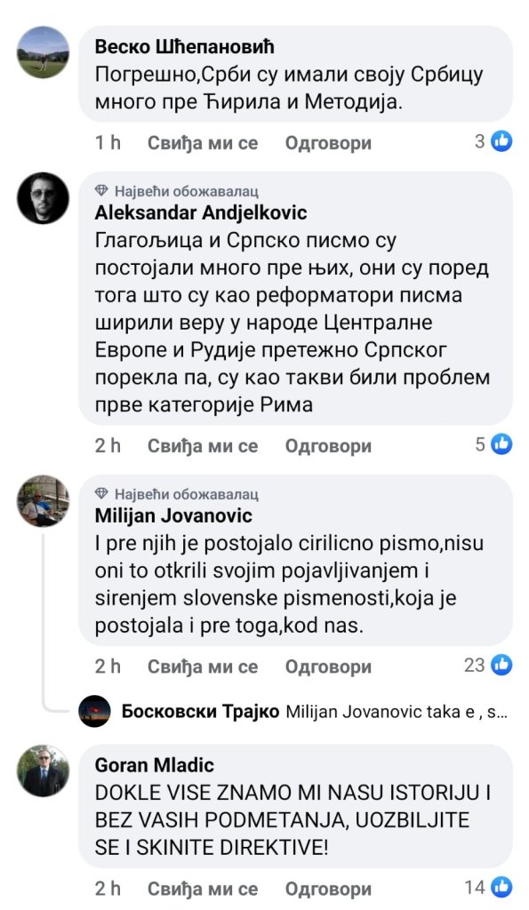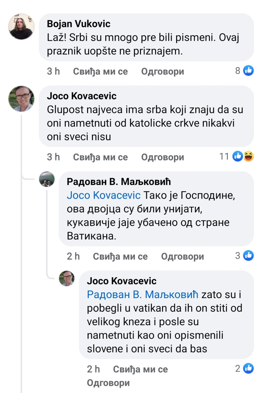 Ова објава изазвала је као 14. фебруара 2024. године (о чему смо писали ОВДЕ), на дан уснућа у Господу Светог Равноапостолног Кирила, Методијевог брата, лавину антихришћанских  коментара у којима су Свети Кирило и Методије етикеторани као педе.и (цензура је наша), чифути, ватиканци, унијати, кукавичје јаје убачено од стране Ватикана, грко-католички фанариоти и агенти који су крали србске књиге итд.