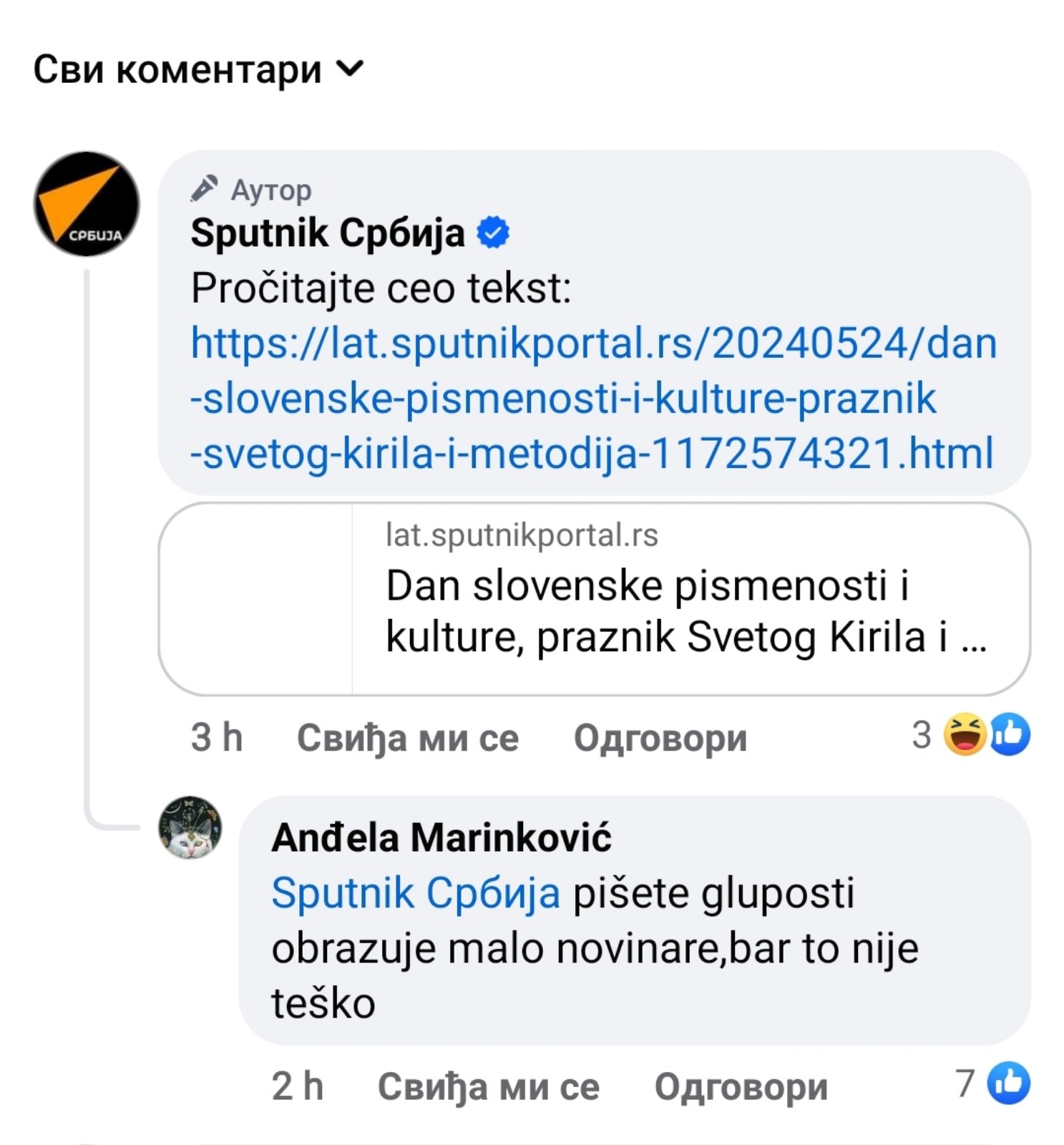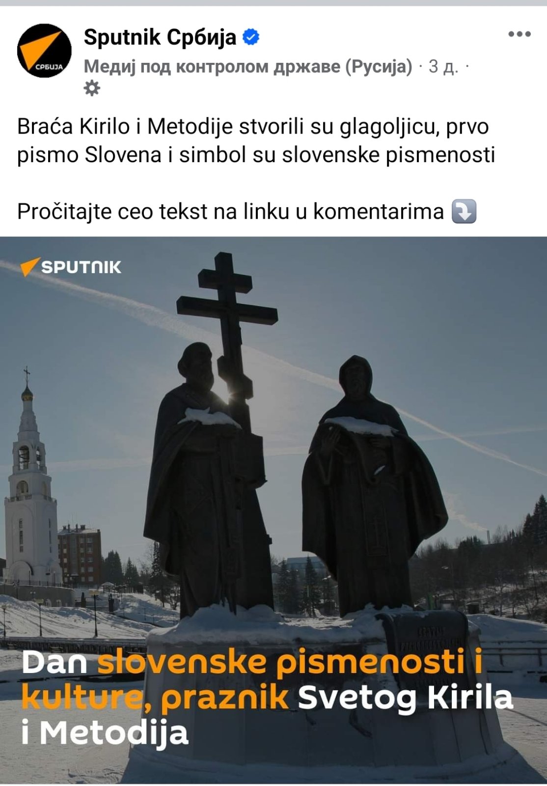 На празник Светих Кирила и Методија који се прославља и као Дан словенске писмености 24. маја 2024. дневне новине ”Спутњик” објавиле су у свом електронском издању текст поводом тога, након чега је постављен и на њиховој званичној страници на Фејсбуку (Facebook).