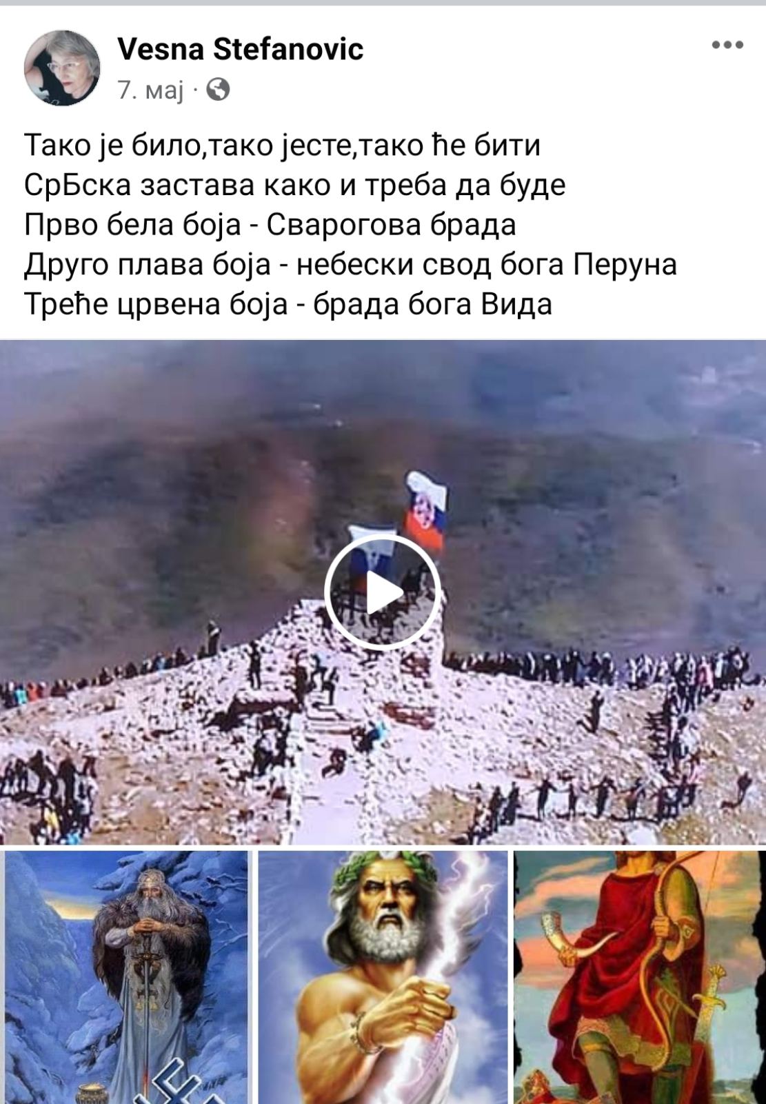 Уколико се погледа профил аутора овог коментара на Фејсбуку (Vesna Stefanovic) објаве које тамо налазимо недвосмислено потврђују претходно написано. Као пример наводимо објаву у којој се боје српске заставе доводе у везу са паганским боговима Сварогом, Перуном и Видом (фотографија испод).
