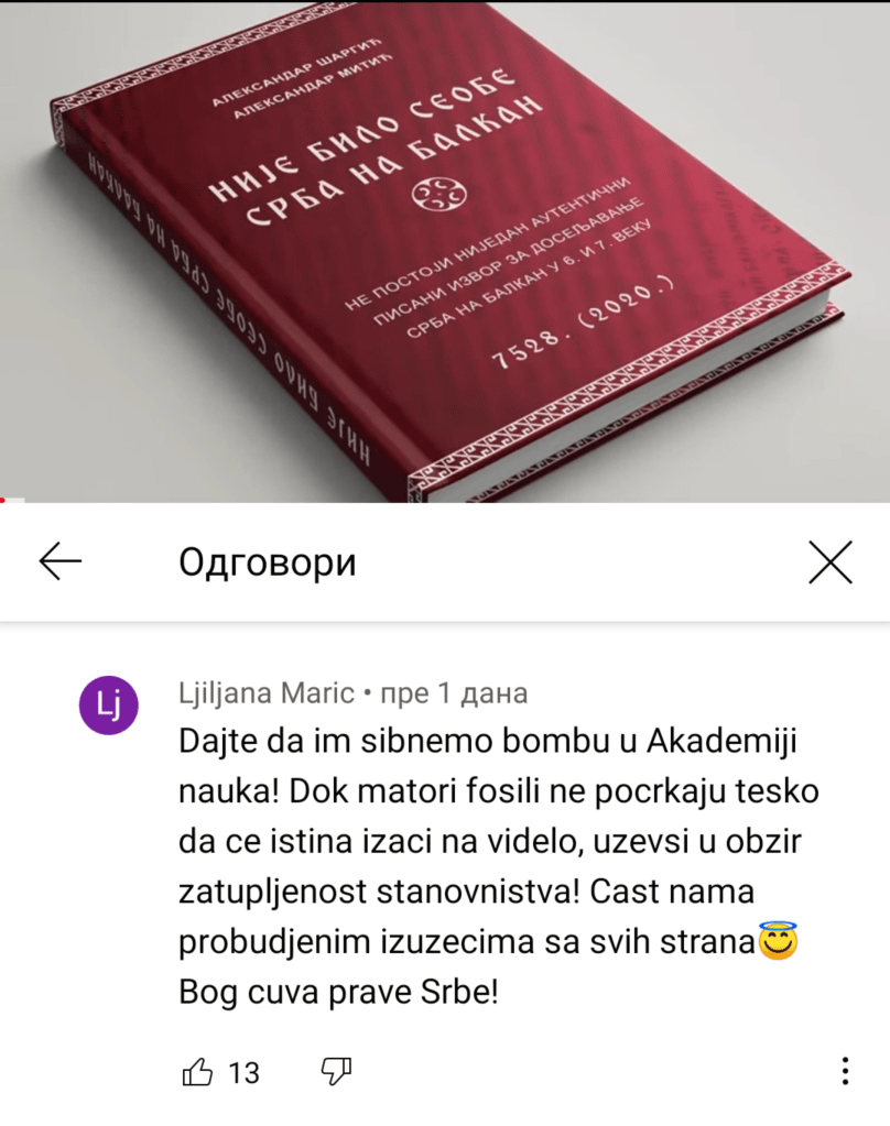 Бројни су и коментари у којима се претње изричу и у множини и односе се на све домаће историчаре: ,,Кад тад ћемо вас очистити из Србије”, ,,Згазићемо вас!!! И све до једног!”, ,,Живим за дан кад ћемо се обрачунати…”, ,,Сва уср.на гов.а (цензура је наша, Д. М.) која ће ускоро да дркћу и моле биће почишћена и завршиће тамо где им је место”, и тако даље. На фотографији испод видимо позив да се у САНУ баци бомба. У питању су коментари испод објаве о књизи Александра Шаргића и Александра Митића ,,Није било сеобе Срба на Балкан”.