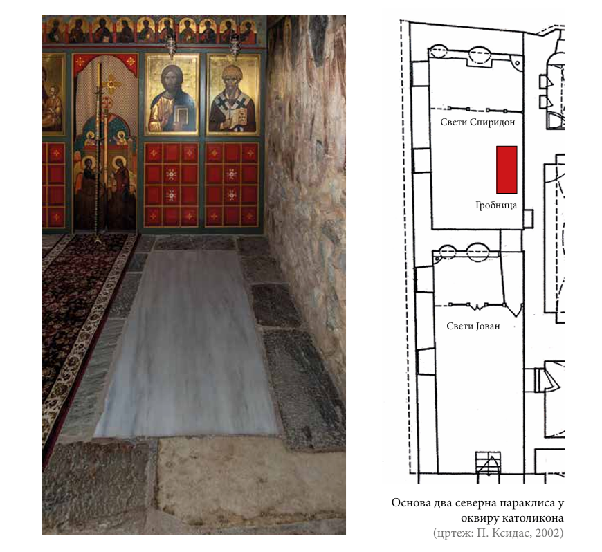 ,,Параклис Светог Спиридона Прислоњени уз северни зид католикона налазе се параклиси Блаженог Јована ктитора и Светог Спиридона. Прва капела у потпуности скрива другу. На десној страни иконостаса Блаженог Јо вана отвара се тајни пролаз ка капели Светог Спиридона. У њој је током реновирања, релативно недавно, откривена подземна гробница, у чијој унутрашњости су пронађени скелети два висока мушкарца. Место гробнице и њен облик (засведена је и зидана опеком 2,4 х 1,7 m, висина 1,55 m), указује да се ради о особама на високим положајима и у ктиторској вези са манастиром. Узи мајући у обзир историјске чињенице, њихово истовремено сахрањивање и тесне везе Угљешине породице са манастиром, сматра се могућим да пронађени посмртни остаци припадају деспоту Јовану и краљу Вукашину, браћи страдалој у Маричкој бици (1371)”.”[5]