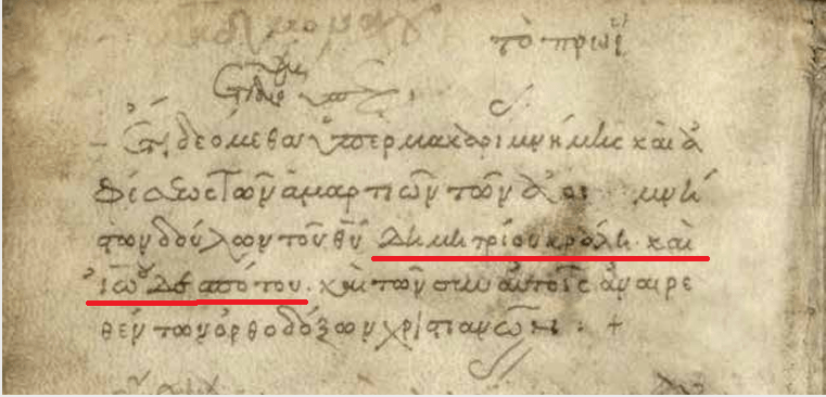 † Ἔτι δεόμεθα ὑπὲρ μακαρίας μνήμης καὶ ἀ/φέσεως τῶν ἁμαρτιῶν τῶν ἀειμνή/στων δούλων τοῦ Θεοῦ Δημητρίου κράλη καὶ / Ἰω(άνν)ου Δεσπότου καὶ τῶν σὺν αὐτοῖς ἀναιρε/θέντων ὀρθοδόξων χριστιανῶν: †