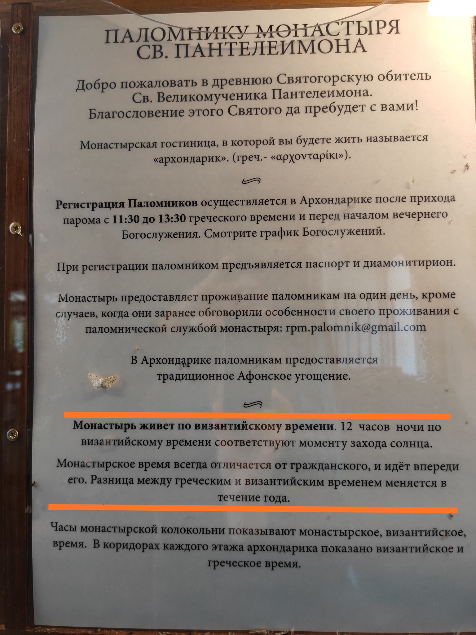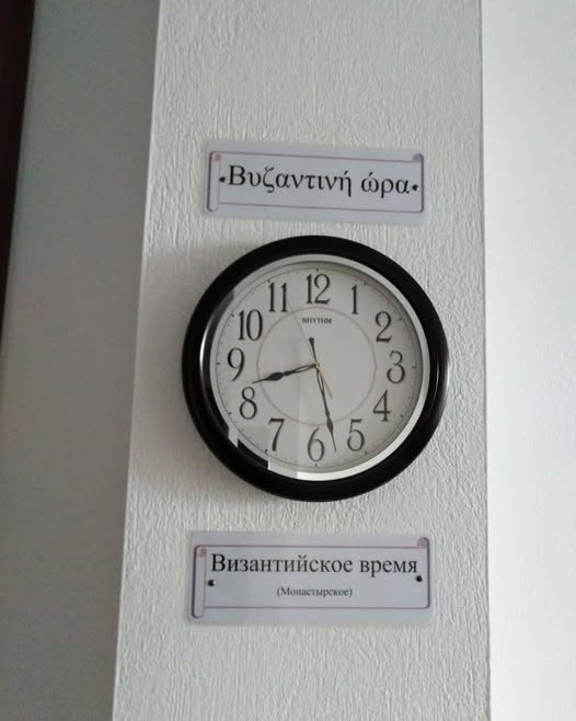 Они који су имали прилику да посете Свету Гору знају да су у већини светогорских манастира, скитова и келија постоје зидни сатови који показују византијско време, али су уз њих, за ходочаснике, постављени и часовници који показују грчко (источноевропско време или EET).