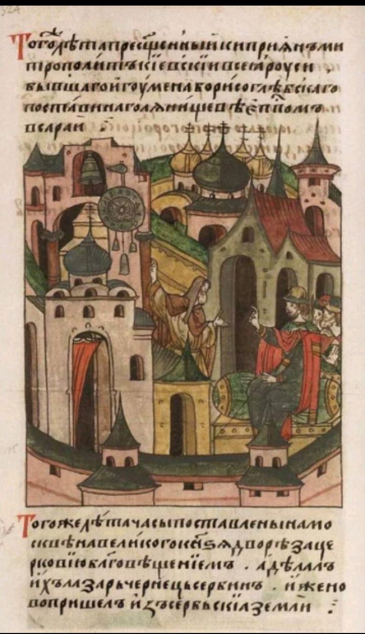 Такође је вредно поменути да су први механички часовник Руси добили захваљујући Србима. Наиме, на позив Великог кнеза Василија I у Москву је 1404. године отпутовао монах Лазар Хиландарац који је поменути часовник направио, а о чему се пише у летопису „ Лицевой летописный свод”, где се налази и минијатура на којој је приказано како монах Лазар показује Великом кнезу часовник. У тексту стоји следеће: „ Лета 6912, Велики кнез је замислио часовник и поставио га је на свој двор иза Благовештењске цркве. Тај часовник звани часомерје, сваки час је ударао маљем у звоно, одмеравао и одбројавао је часове ноћне и дневне; није (то) ударао човек, него нешто човеку налик, самозвоно и самопокретно, чудновато некако, створено људском оштроумношћу, маштом и мудрошћу. Мајстор и уметник свему био је неки монах који је скоро дошао са Свете Горе, родом Србин, по имену Лазар. Цена свега била је више од 150 рубаља.“ (2)