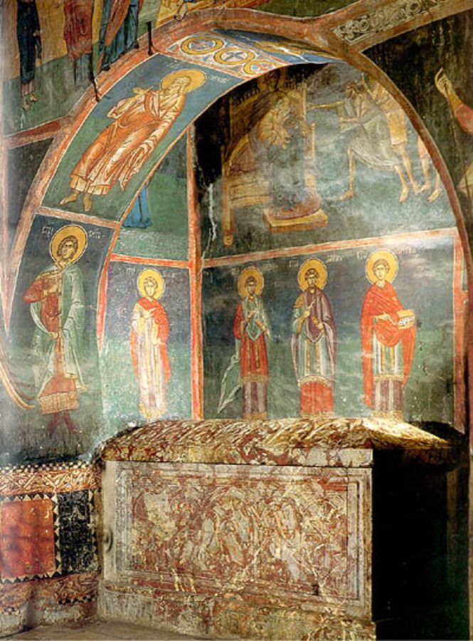 Када је реч о његовим представама у средњовековној уметности ,,најстарији пример, ако изузмемо поменуту представу с диптиха из манастира Светог Павла, налази се у цркви Богородице Одигитрије у пећи. Настао је око 1335. године”.