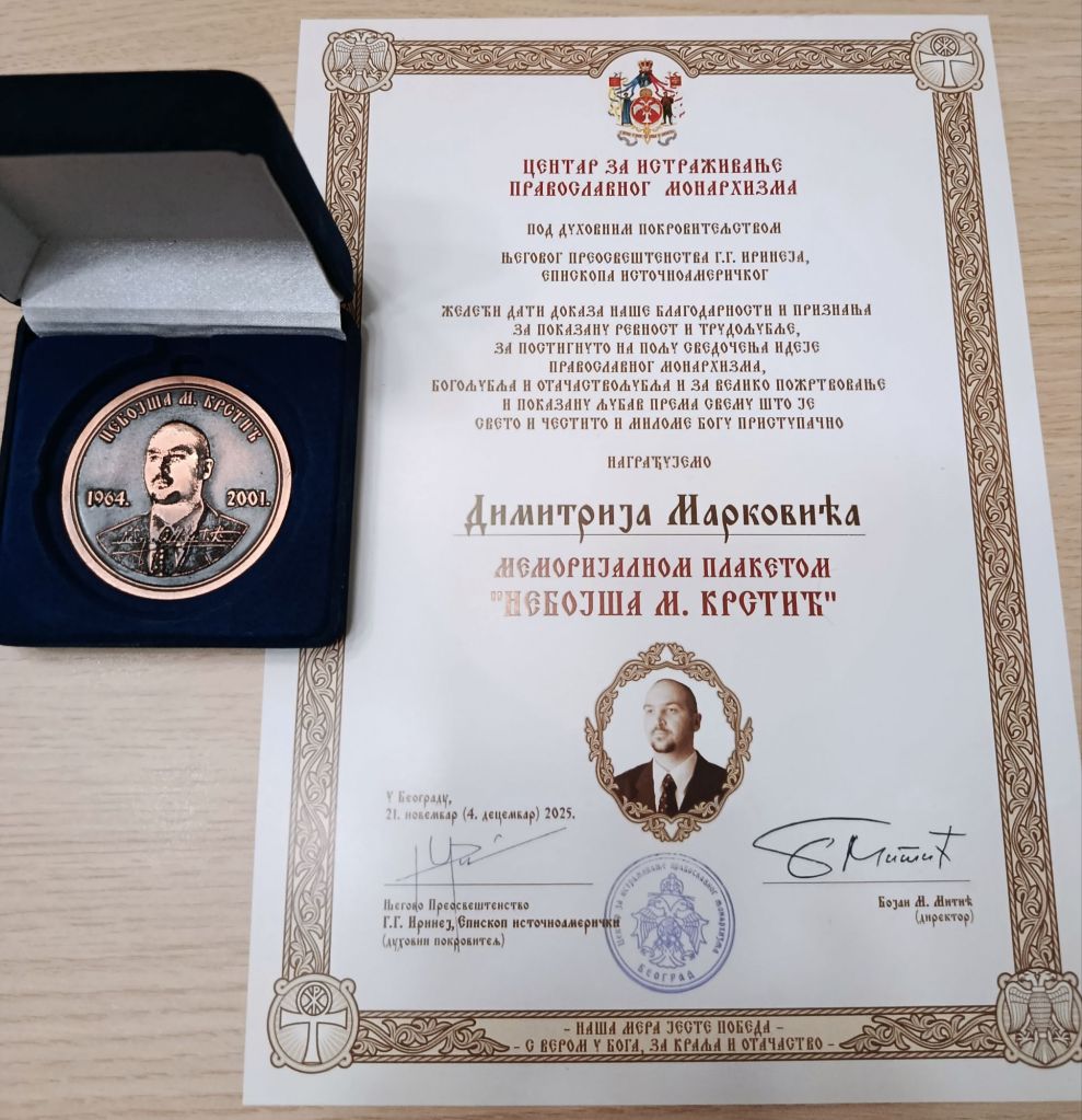 ”На основу одлуке нашег Одбора за доделу Меморијалне плакете „Небојша М. Крстић“, а водећи се званичним Правилником, желећи дати доказа наше благодарности и признања за показану ревност и трудољубље, постигнуто на пољу сведочења идеје православног монархизма, богољубља и отачаствољубља, као и за велико пожртвовање и показану љубав према свему што је свето и честито и миломе Богу приступачно, у име сарадника Центра за истраживање православног монархизма, највишим признањем Центра биће награђен Димитрије Марковић.